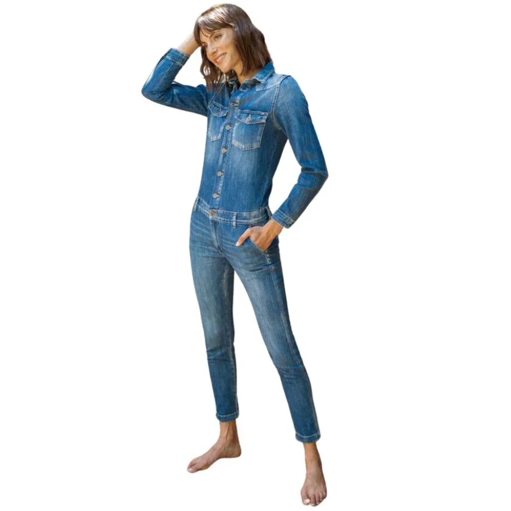 This Sena blue denim jumpsuit will give you a trendy casual look with its custom LTC button closure and many small details.- Blue jumpsuit