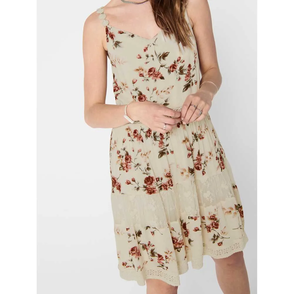 – Short printed dress with lace details