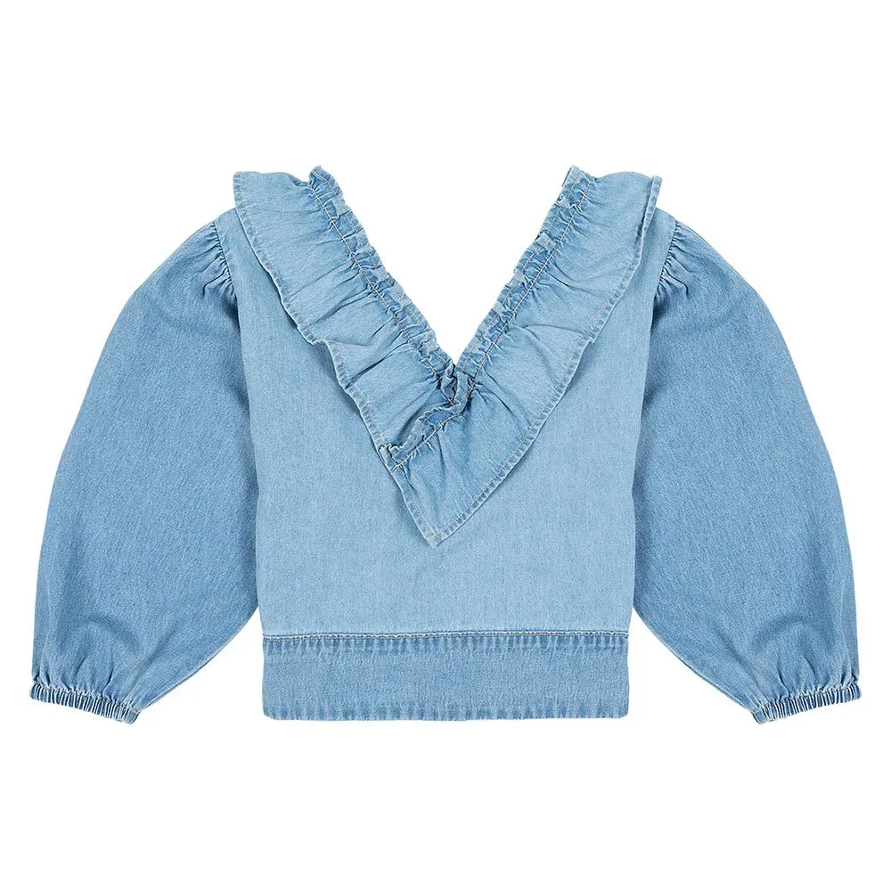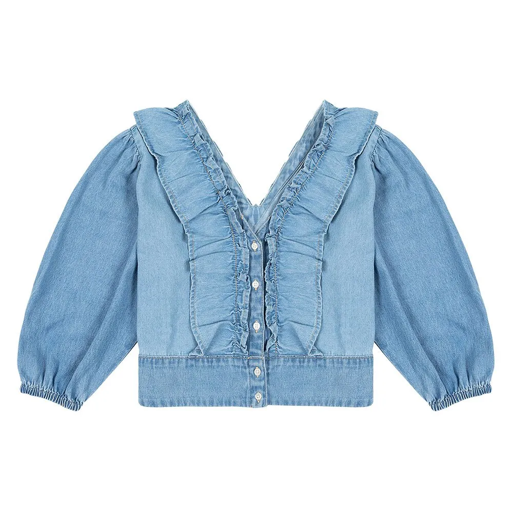 Drawing on authentic Western styling with a feminine edge, this blouse features a frilled design and billowy sleeves, and is finished in light blue stone-washed denim.